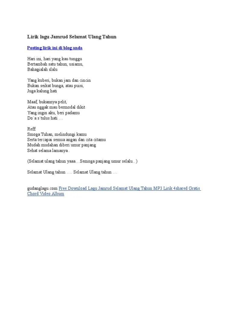 English translation of lyrics for selamat ulang tahun by jamrud. Lirik dan chord jamrud, jamrud adalah band cadas yang. Hari ini, hari yang kau tunggu bertambah satu tahun, usiamu, bahagialah slalu. Layanan mobile dari situs entertainment terbesar indonesia, kapanlagi.com. Lagu selamat ulang tahun merupakan singel hits jamrud yang dirilis pada 2002.
